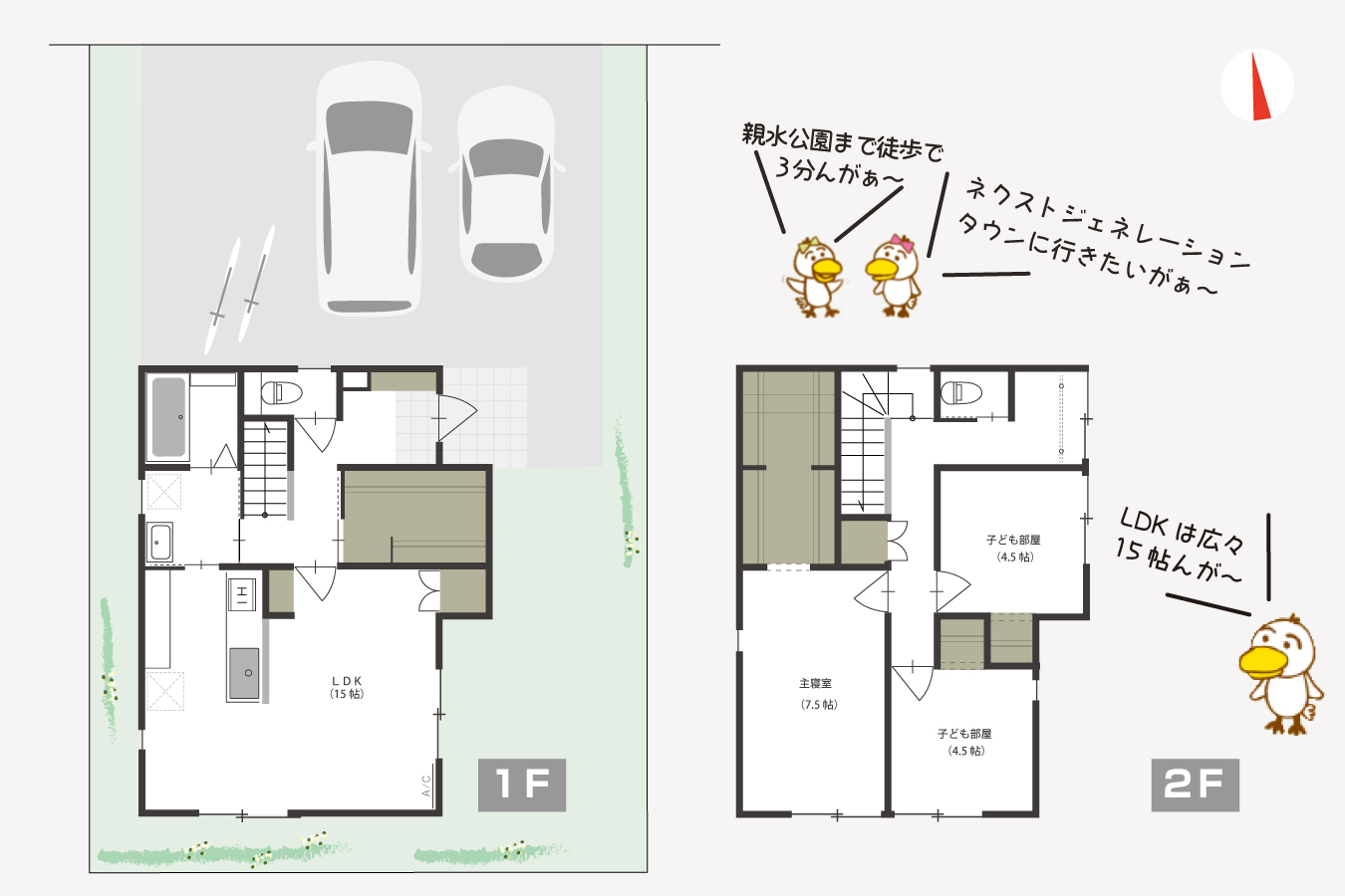 親水公園まで180m。ネクストジェネレーションタウンまで65m。楽しく遊べるエリアが近くで、パパもママもちょっと嬉しい。