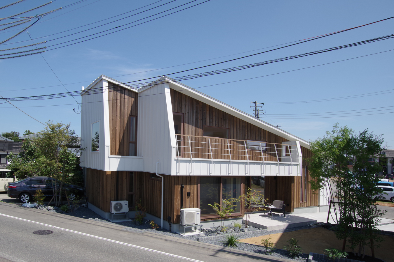 木の外壁とホワイトカラーのガルバリウムでまとめた外観。鋭角な三角形を2つ並べたうような外観はそれだけでアクセントとなる。