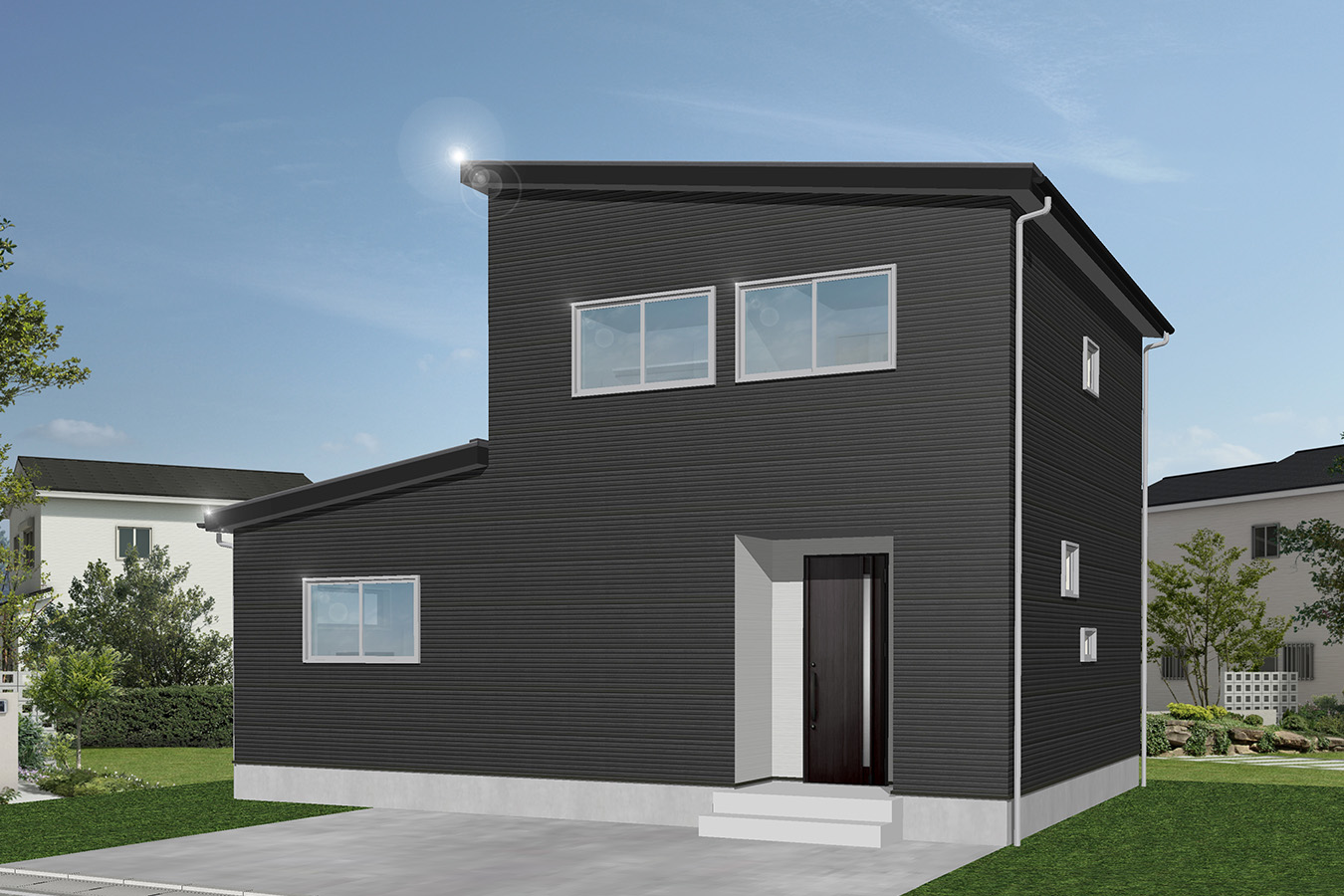• 黒を基調に、屋根とポーチをブラックで統一。 外観はブラック×ホワイトのツートンで立体感を演出。 重厚感と個性を兼ね備えた、洗練されたデザインです。