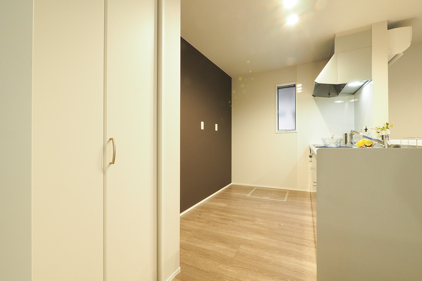 キッチンから1歩でつながる動線で、お料理の合間に一緒にお洗濯もできて家事効率もアップ♪