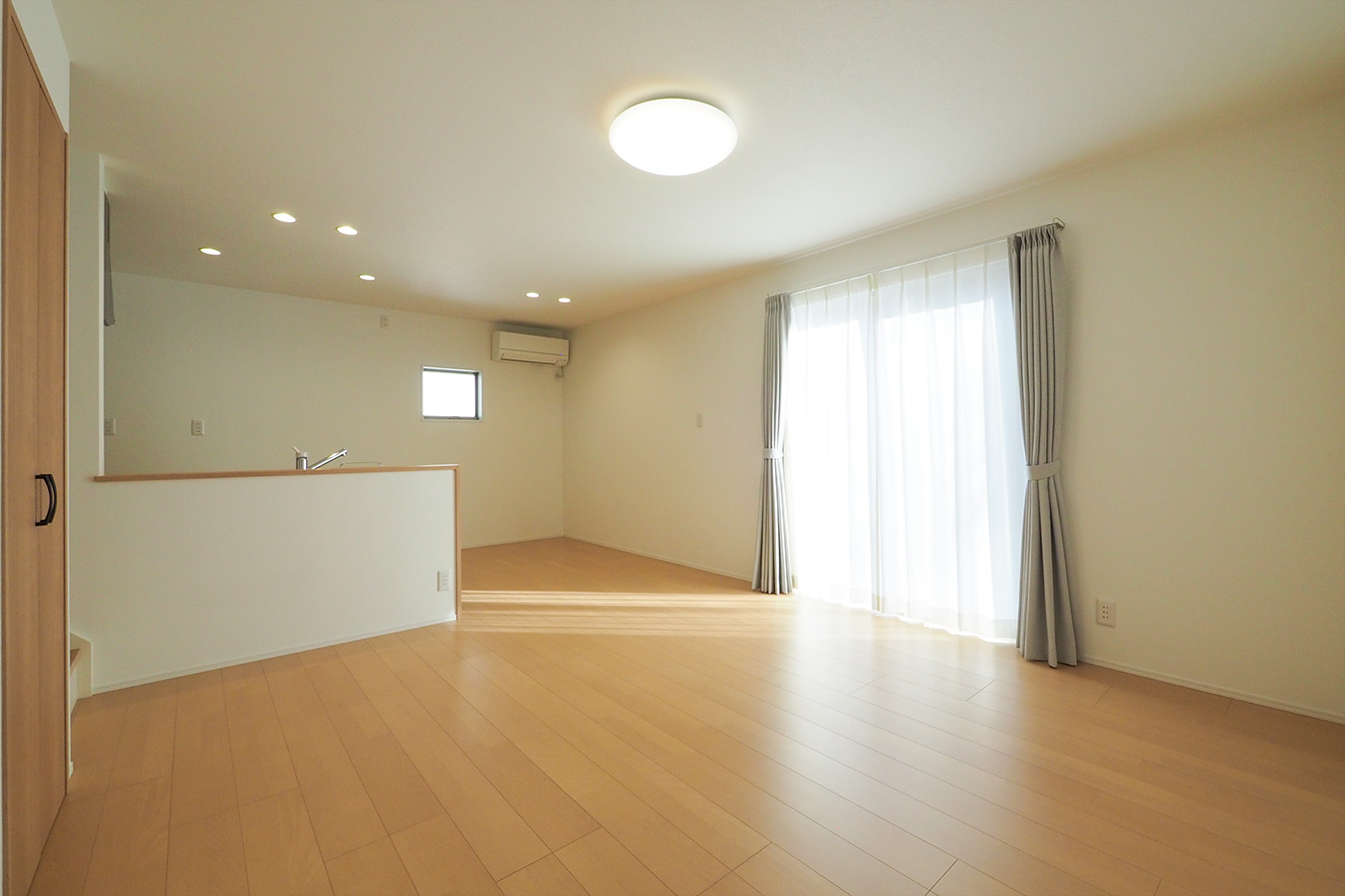 南向きの掃き出し窓から光が入る明るいLDKです。