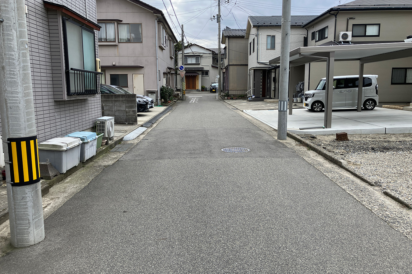 前面道路の幅員は5mです。車通りの少ない閑静な住宅地です。